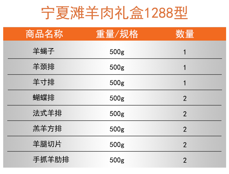 10袋:蝴蝶排、羊蝎子、羊寸排、羊腿切片、法式羊排、羔羊方排、手抓羊肋排