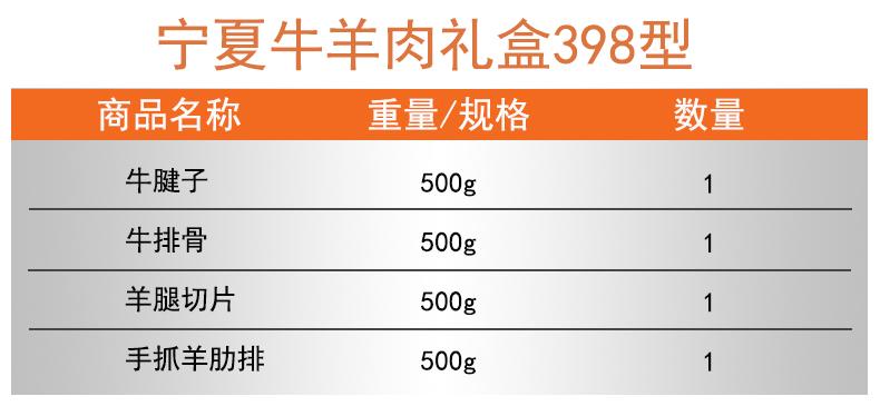 10袋:牛上脑、牛脖骨、牛腩肉、牛腱子、羊蝎子、羊寸排、羊腿切片、法式羊排、羔羊方排