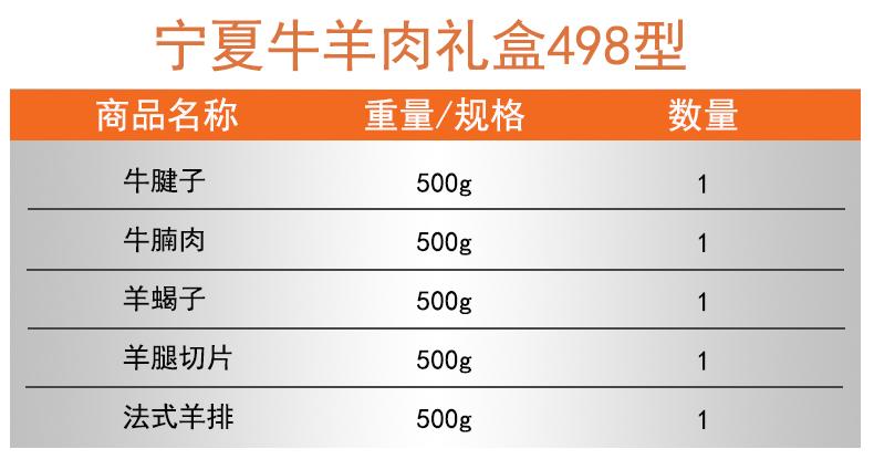 10袋:牛上脑、牛脖骨、牛腩肉、牛腱子、羊蝎子、羊寸排、羊腿切片、法式羊排、羔羊方排