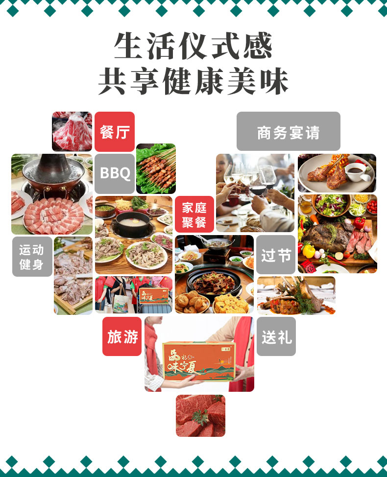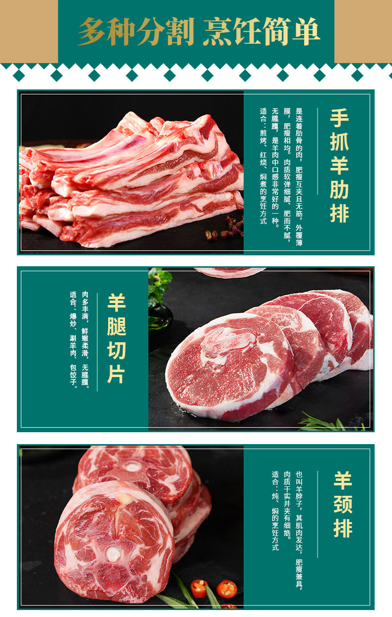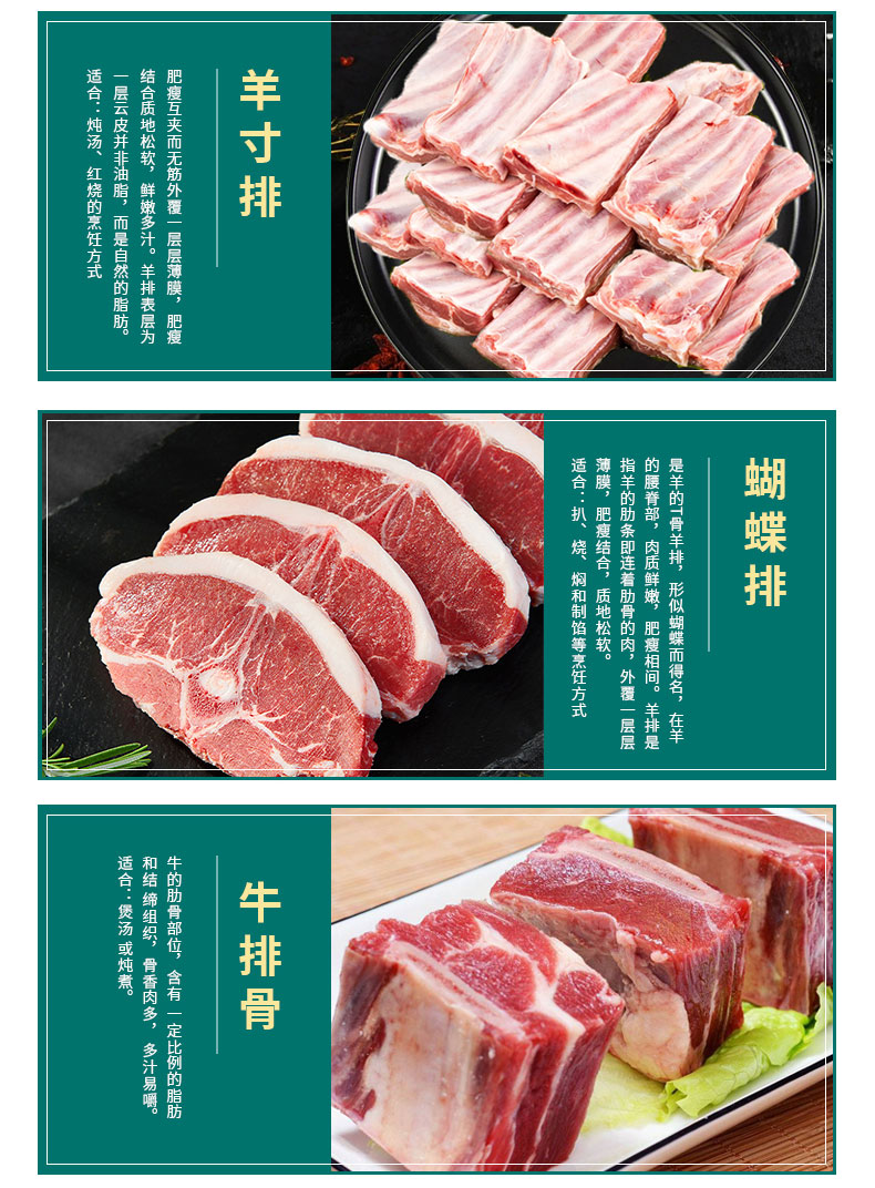 8袋:上脑肉、牛排骨、牛腱子、牛腩肉、蝴蝶排、法式羊排、羊腿切片