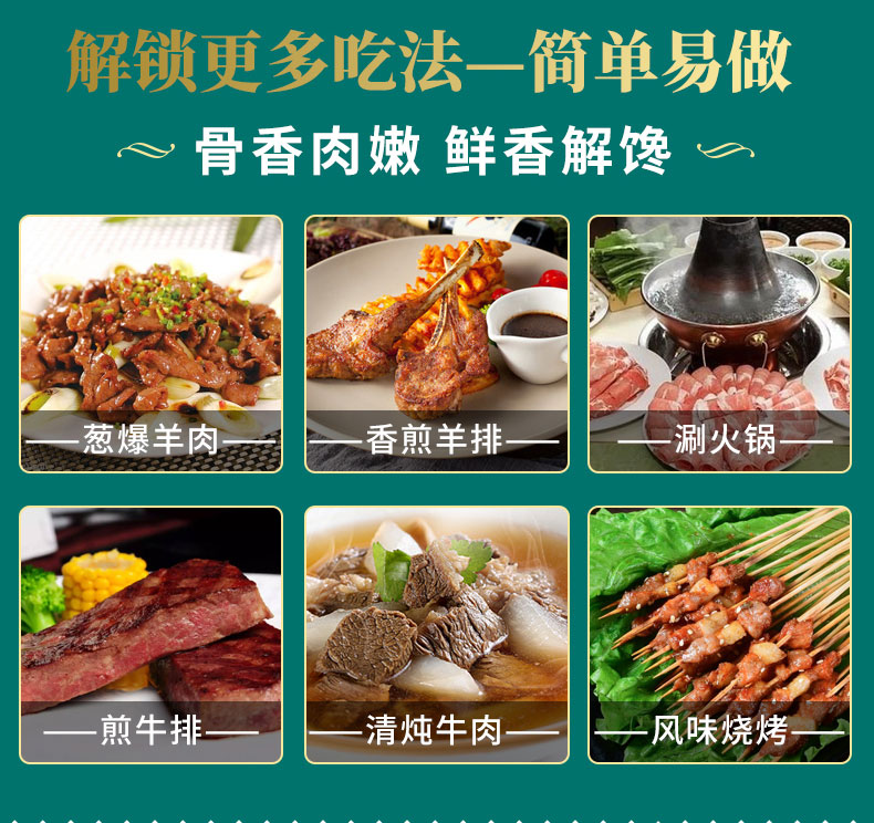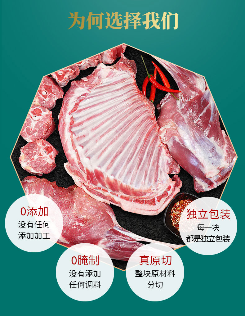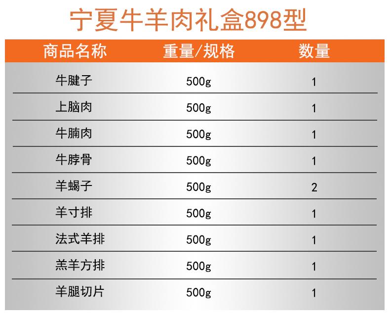 8袋:牛腱子、牛腩肉、上脑肉、牛棒骨、羊蝎子、羊腿切片、羔羊方排